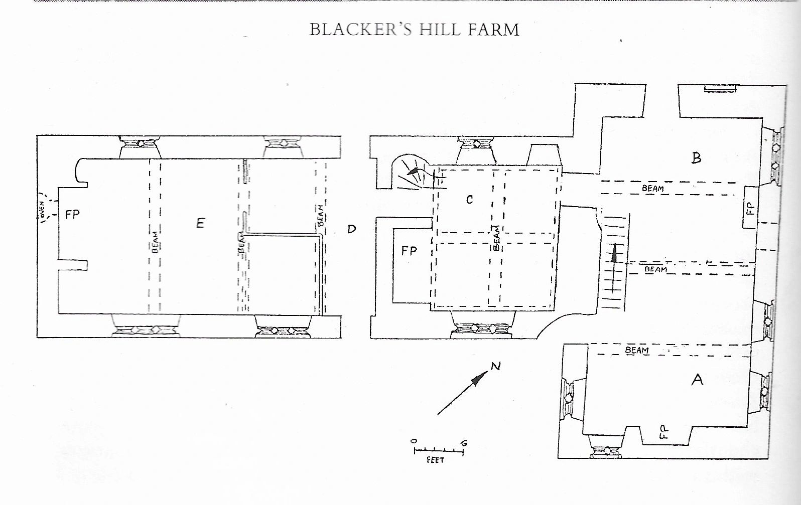 The farmhouse is reached by means of a lengthy driveway off the south side of Coal Lane and is named after the Blacker families who lived there in the lates 1500's. The house is situated adjacent to the ramparts of Blacker's Hill Camp, the prehistoric/ Iron Age earthworks that must also have served to guard the Fosse Way from the west. These ramparts are now scheduled for preservation as an Ancient Monument.